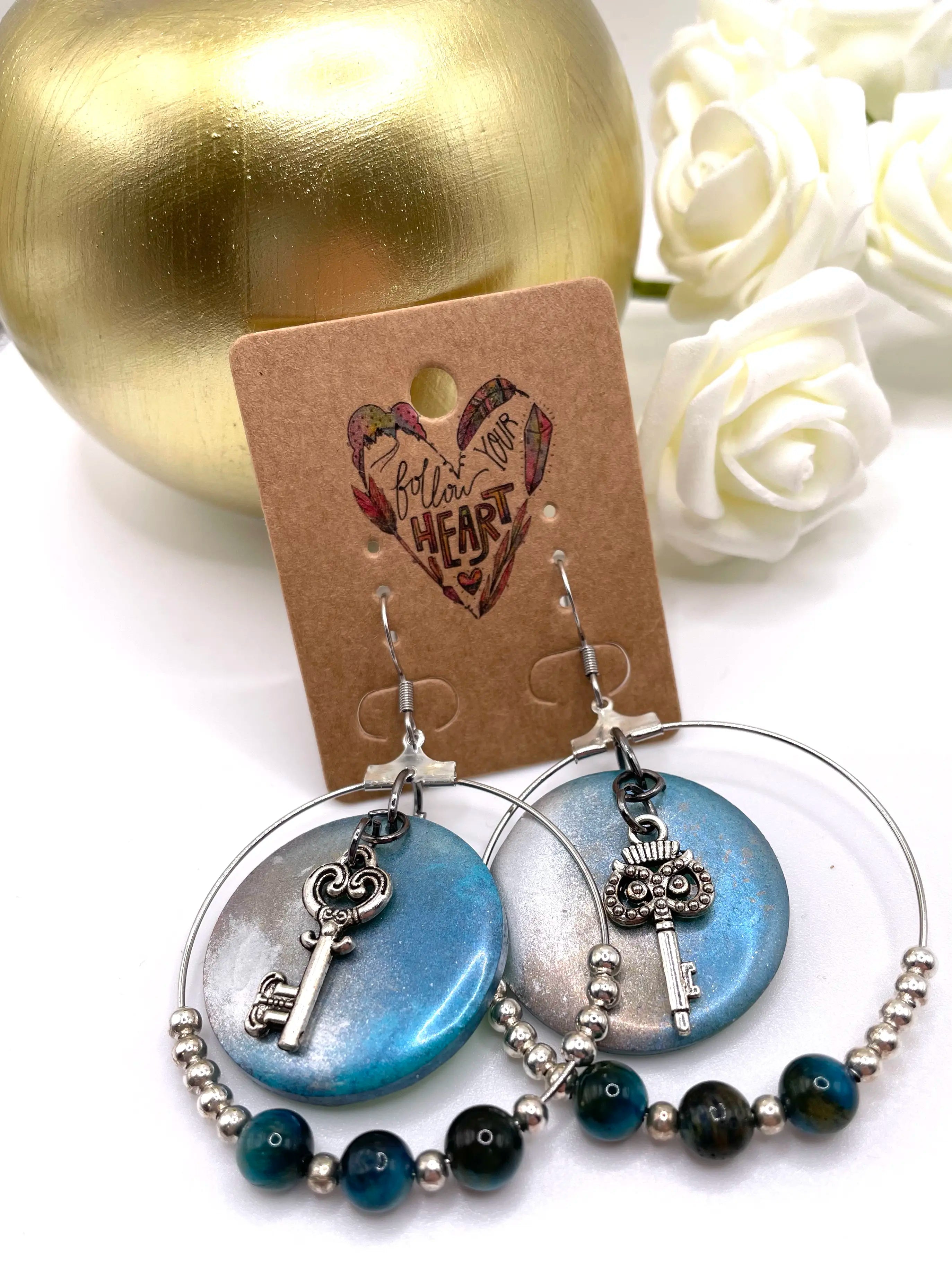 Tauchen Sie ein in die Welt des handgefertigten Luxus mit unseren "Azure Harmony Ohrringen". Diese atemberaubenden Ohrringe verschmelzen edles Silber mit einem tiefen Blauton, handgefertigten Perlen, einem Plättchen aus glänzendem Epoxidharz und einem charismatischen Schlüsselanhänger. Ein modernes Schmuckstück, das Eleganz und Individualität vereint.