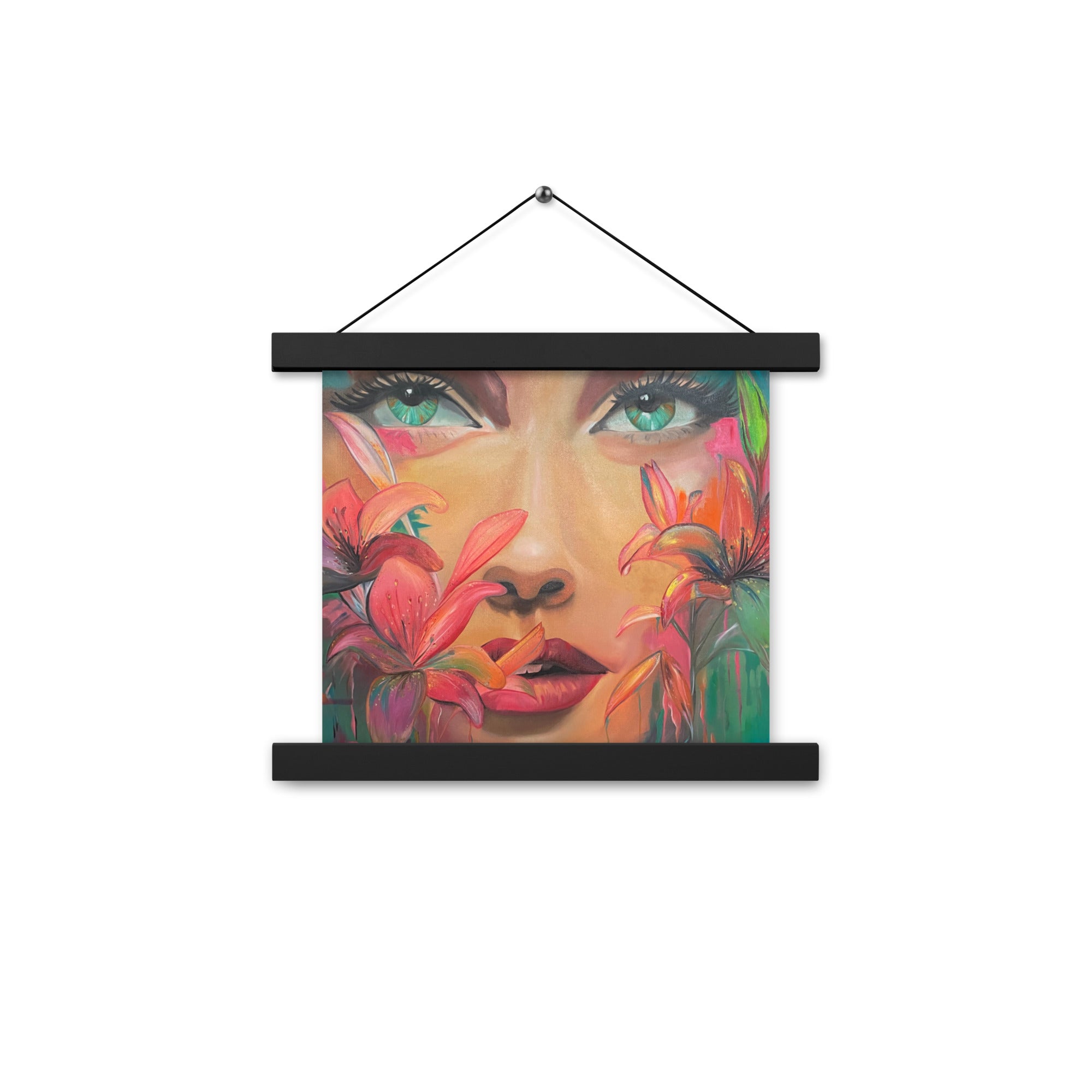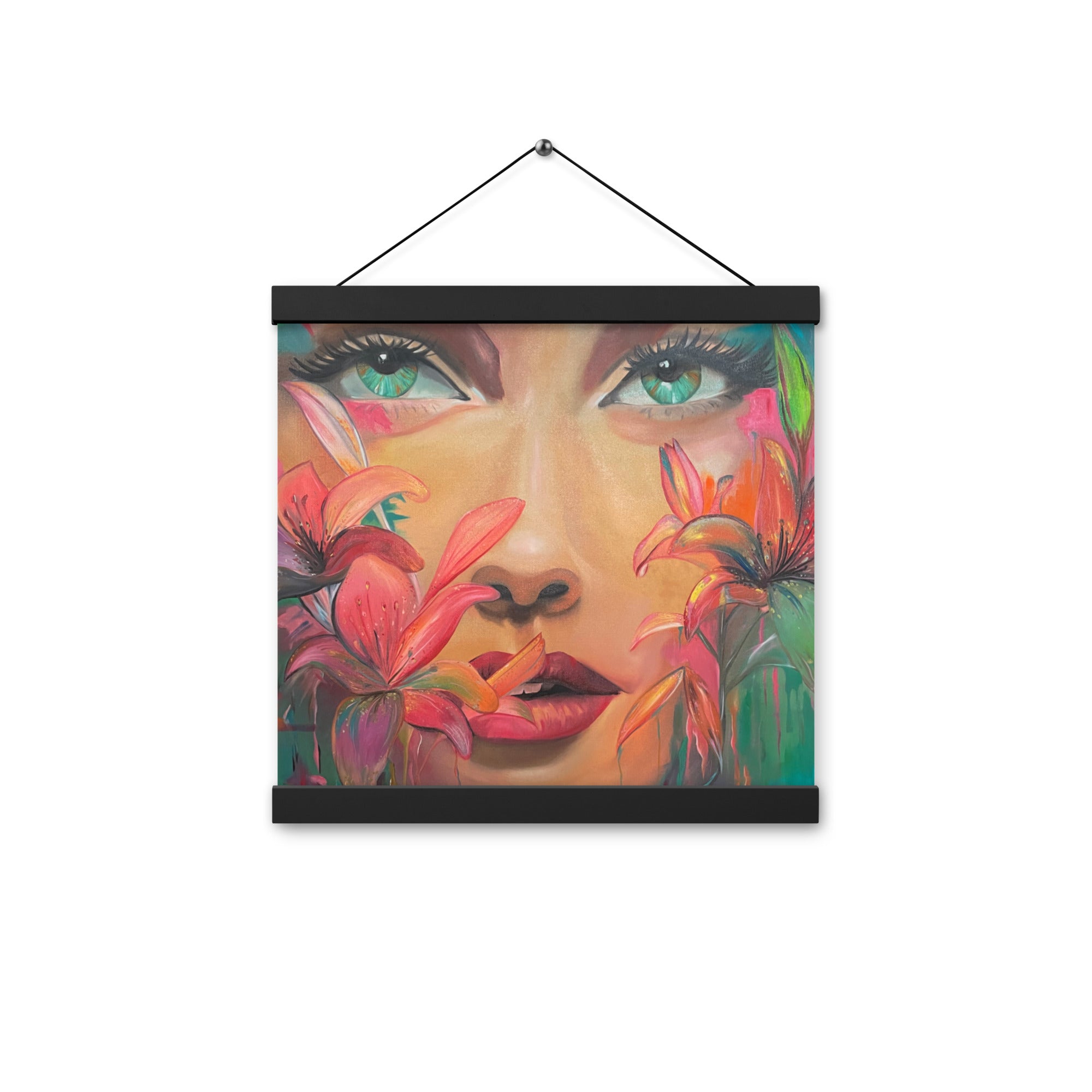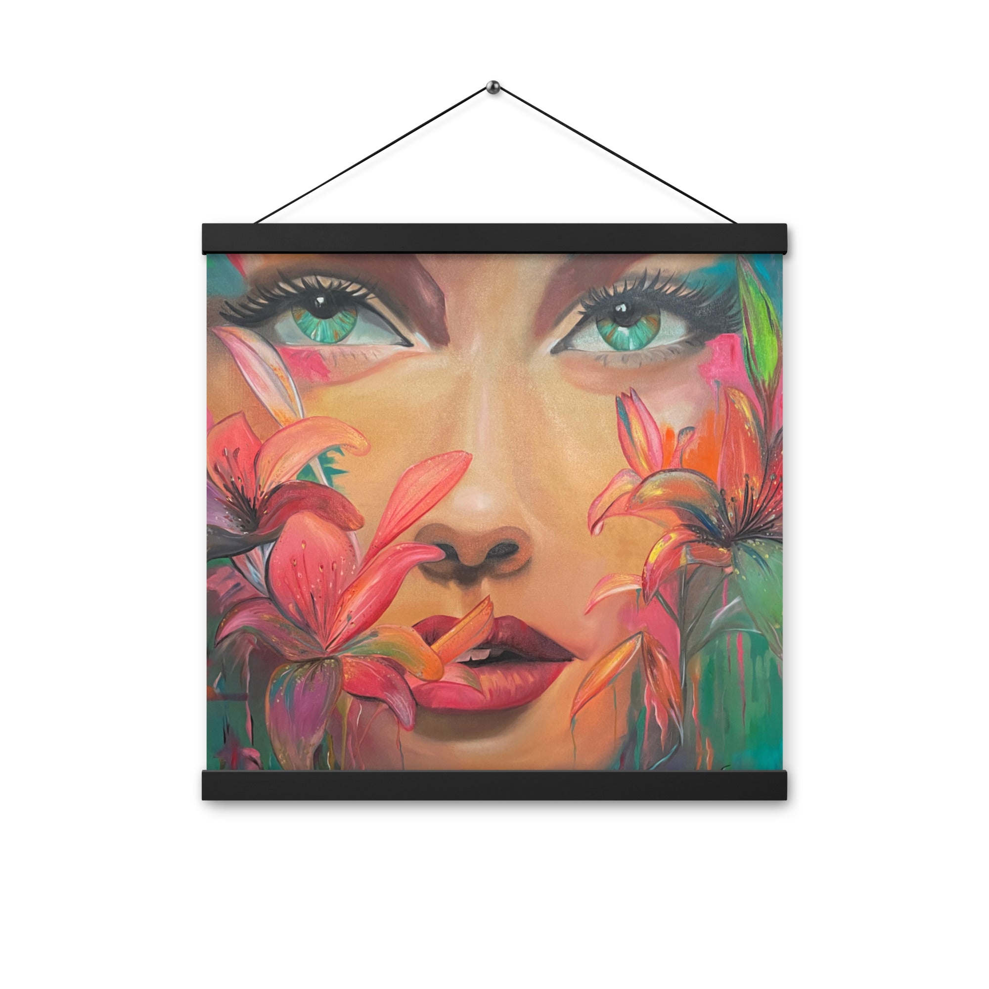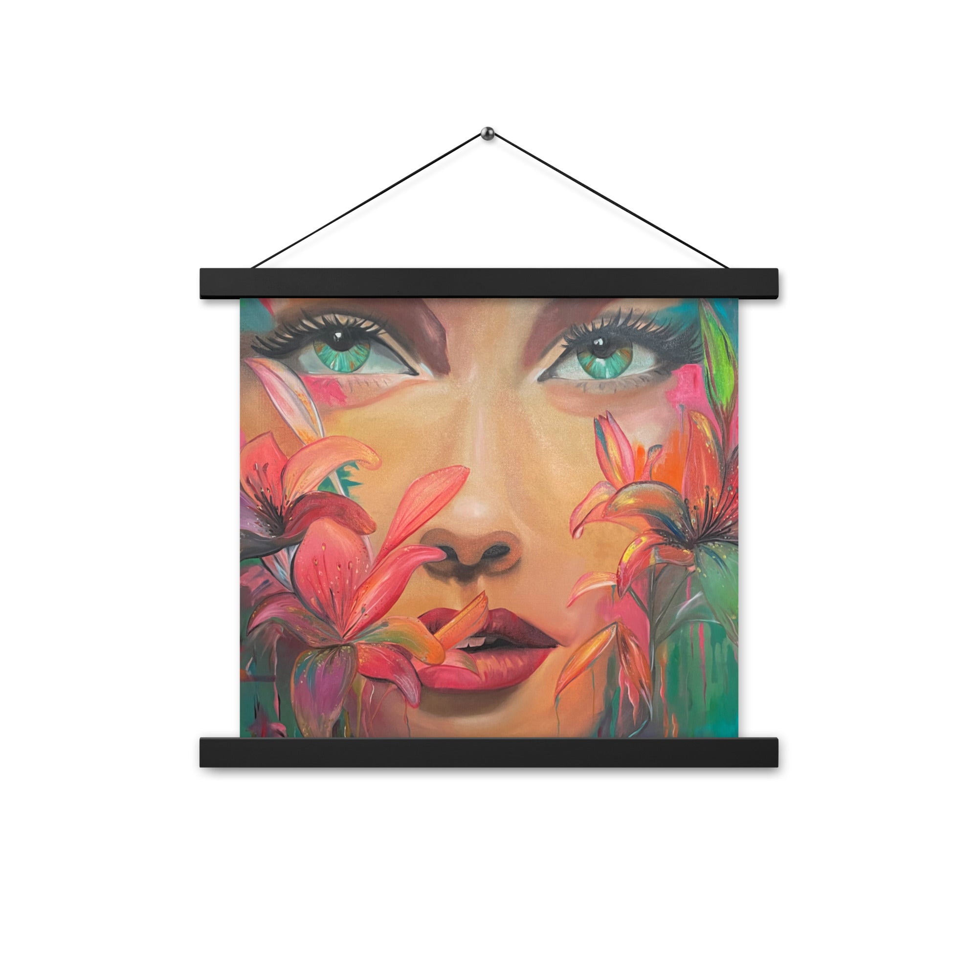 Das Werk zeigt das Porträt einer Frau, deren Gesicht von Blüten umrahmt wird. Ausdrucksstark und intensiv blickt sie den Betrachter an – geheimnisvoll, stark und zugleich verletzlich. Die kräftigen, leuchtenden Farben und die floralen Details symbolisieren die Vielfalt weiblicher Emotionen und die untrennbare Verbindung zwischen Mensch und Natur.
